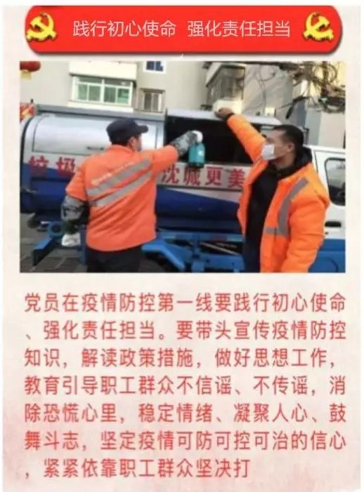 中共中環(huán)潔(沈陽(yáng))城市環(huán)境服務(wù)有限公司黨委第一時(shí)間發(fā)起《致廣大黨員倡議書(shū)》,向廣大黨員傳達(dá)了黨中央的號(hào)召,吹響參加抗疫阻擊戰(zhàn)的集結(jié)號(hào),下達(dá)了投身抗疫斗爭(zhēng)的動(dòng)員令。